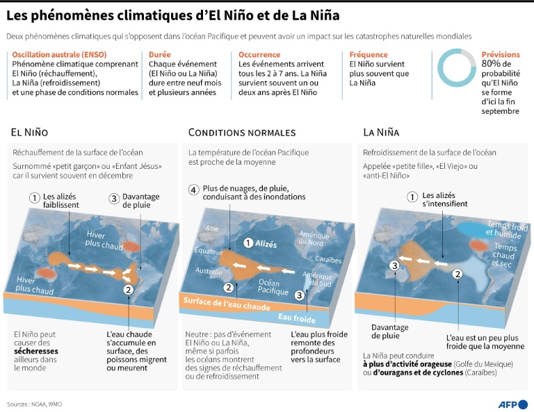 À ce stade, il n'est pas possible de prédire l'intensité ou la durée d'El Nino qui se profile. Le dernier en date était considéré comme faible, mais celui d'avant, entre 2014 et 2016, était puissant et il a eu des conséquences désastreuses. L'OMM a souligné que 2016 a été "l'année la plus chaude jamais enregistrée en raison du 'double effet' d'un El Nino très puissant et du réchauffement provoqué par les gaz à effet de serre liés à l'activité humaine".
