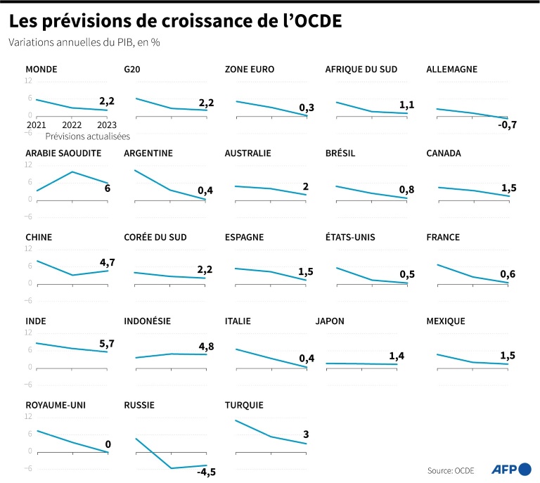 L'OCDE table sur une progression du PIB mondial de 2,2% contre 2,8% attendus en juin, bien qu'elle ait maintenu sa prévision pour 2022 à 3% après l'avoir nettement réduite ces derniers mois.