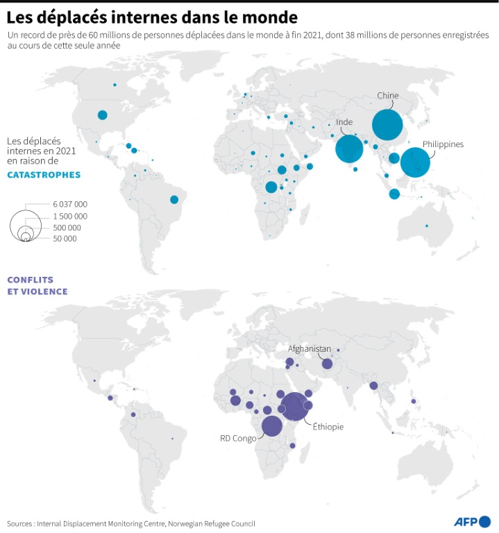 Les personnes déplacées internes étaient 59,1 millions en 2021, dont près de la moitié avaient moins de 18 ans, selon l'Internal Displacement Monitoring Centre (IDMC) et le Conseil norvégien pour les réfugiés (NRC).