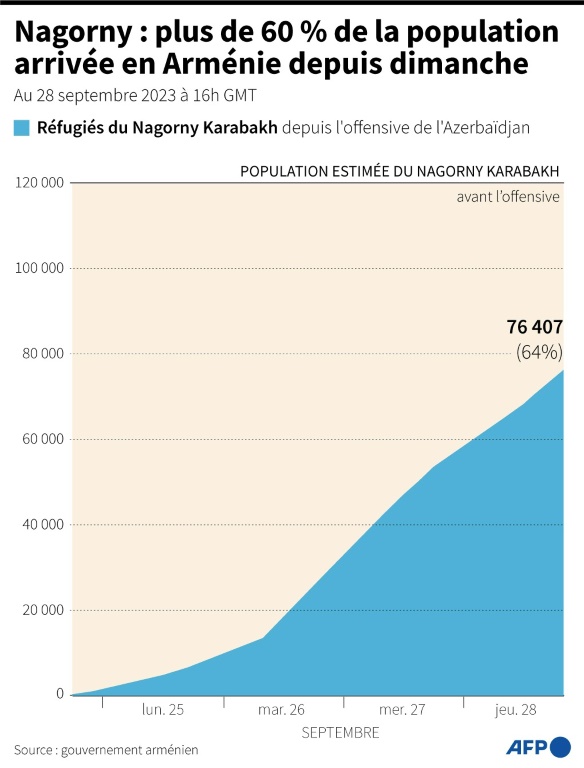 En quelques jours, 88.780 personnes, soit prÚs des trois-quarts des 120.000 habitants officiels du territoire, ont quitté leur foyer, selon le dernier décompte publié par Erevan.