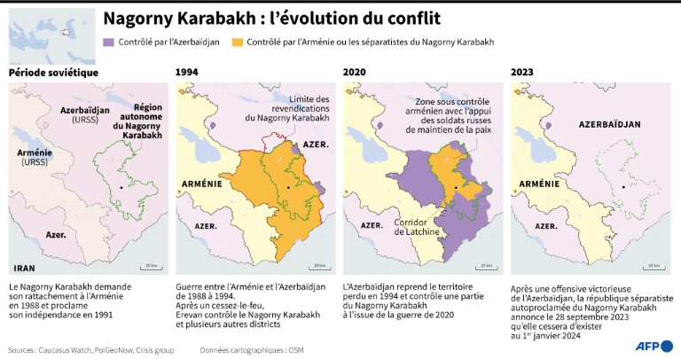 Cette région à majorité chrétienne, qui avait fait sécession de l'Azerbaïdjan à majorité musulmane à la désintégration de l'URSS, s'est opposée pendant plus de trois décennies à Bakou, notamment lors de deux guerres entre 1988 et 1994 et à l'automne 2020.