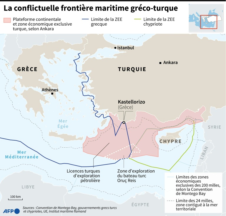 Athènes estime qu'Ankara viole sa souveraineté en explorant les eaux grecques et exige le retrait de tous les navires turcs du plateau continental grec. La Turquie de son côté affirme être dans son bon droit en explorant ses eaux littorales. La crise en Méditerranée orientale est au programme d'un sommet européen les 24 et 25 septembre à Bruxelles.