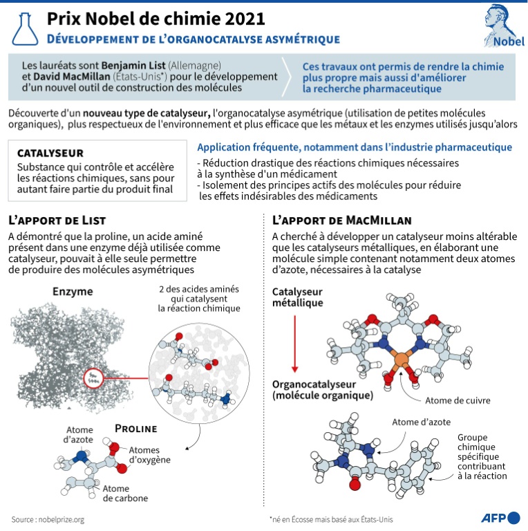 Mais les chercheurs ont longtemps cru qu'il n'y avait, en principe, que deux types disponibles: les métaux et les enzymes. Indépendamment l'un de l'autre, List, basé dans la Ruhr en Allemagne, et MacMillan, né en Ecosse mais qui a confirmé avoir la double nationalité américaine et britannique, ont mis au point une troisième voie. Ils ont employé de "petites molécules organiques" comme la proline et continuent à être à l'avant-garde dans ce domaine, a salué le jury Nobel.