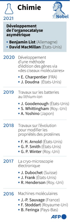 L'année dernière, le prix de chimie avait été attribué à la Française Emmanuelle Charpentier et à l'Américaine Jennifer Doudna, deux généticiennes qui ont mis au point des "ciseaux" capables de modifier les gènes humains, une percée révolutionnaire.