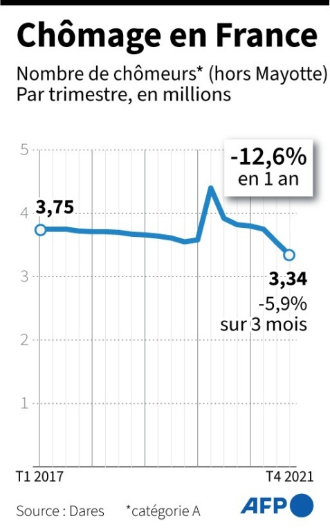 Le nombre de chômeurs (catégorie A, sans activité) a enregistré en France (hors Mayotte) une nette baisse de 5,9% au quatrième trimestre 2021 par rapport au trimestre précédent, soit 208.500 inscrits en moins, à 3,336 millions, selon les chiffres publiés mercredi par Pôle emploi.