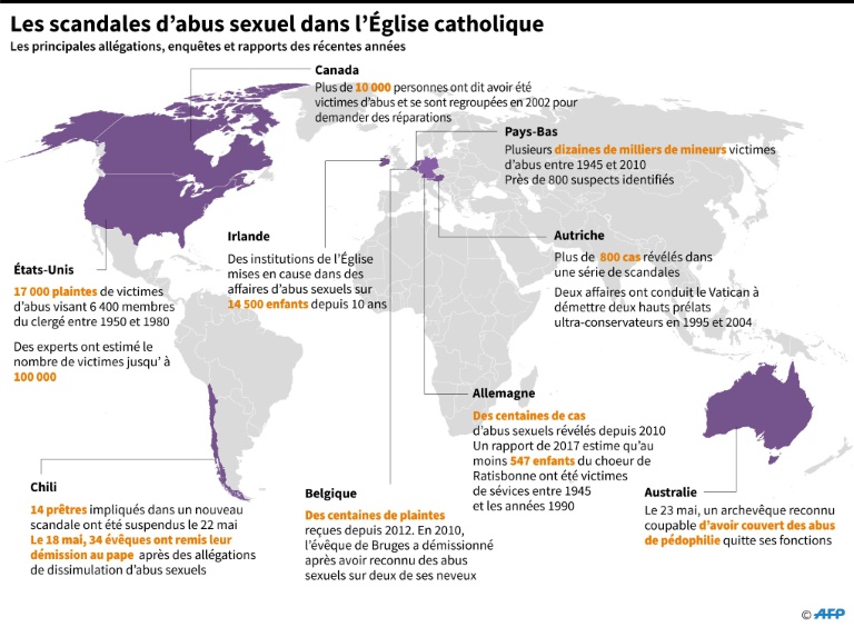 Le pape François a accepté jeudi la démission de deux nouveaux évêques chiliens (portant leur total à cinq), continuant ainsi à sanctionner une hiérarchie de l4Église accusée d'omerta par des victimes de prêtres pédophiles.