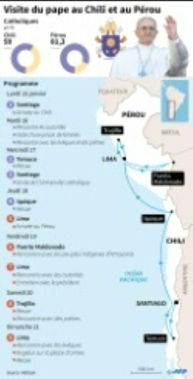 A Temuco, à plus de 600 kilomètres au sud de Santiago du Chili, le pape s'adressera mercredi aux indigènes Mapuche (7% de la population chilienne), qui occupaient un vaste territoire à l'arrivée des conquistadors espagnols au Chili en 1541.