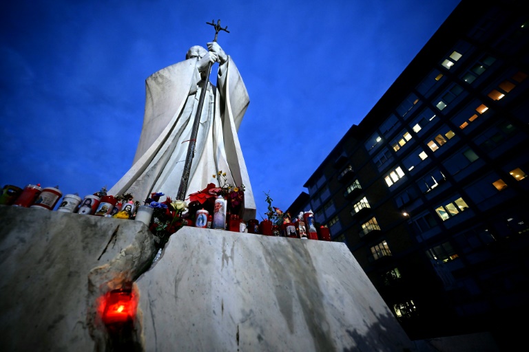 De nombreux fidèles, mais aussi beaucoup de religieux se sont retrouvés devant l'hôpital pour prier pour la guérison du pape François autour de la statue de Jean Paul II qui fait face à l'hôpital.