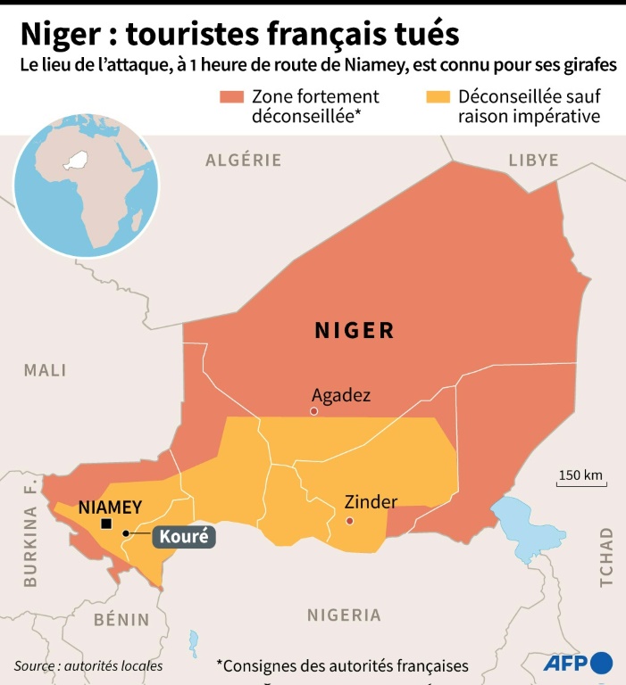Les meurtres n'ont pas été revendiqués, mais ils surviennent dans un pays régulièrement frappé par les groupes jihadistes sahéliens, dont l'Etat islamique au Grand Sahara (EIGS). "On ne connaît pas l'identité des assaillants mais ils sont venus à moto à travers la brousse et ont attendu l'arrivée des touristes", a indiqué une source proche des services de l'environnement.