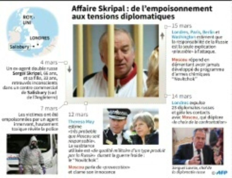 L'attaque à l?agent innervant menée contre l?ex-agent double Sergueï Skripal, 66 ans, et sa fille Ioulia, 33 ans, le 4 mars à Salisbury (sud-ouest de l'Angleterre) a été attribuée à la Russie mais Moscou se défend de toute responsabilité et l'Occident a du mal à prouver l'implication des autorités.