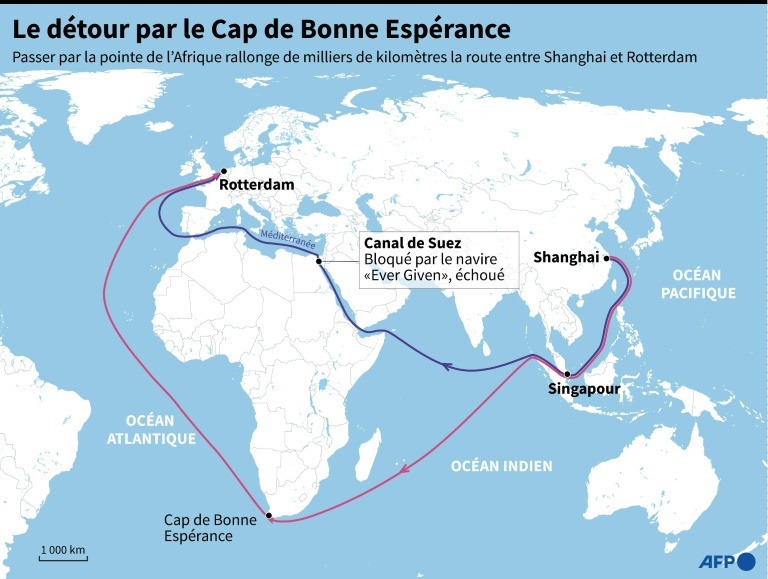 Le canal de Suez, long de quelque 190 km, voit passer environ 10% du commerce maritime international et chaque journée d'indisponibilité entraîne d'importants retards et coûts. Au total, 425 navires étaient coincés lundi matin aux extrémités et au milieu du canal reliant la mer Rouge à la mer Méditerranée, selon la revue spécialisée dans le transport maritime Lloyd's List.