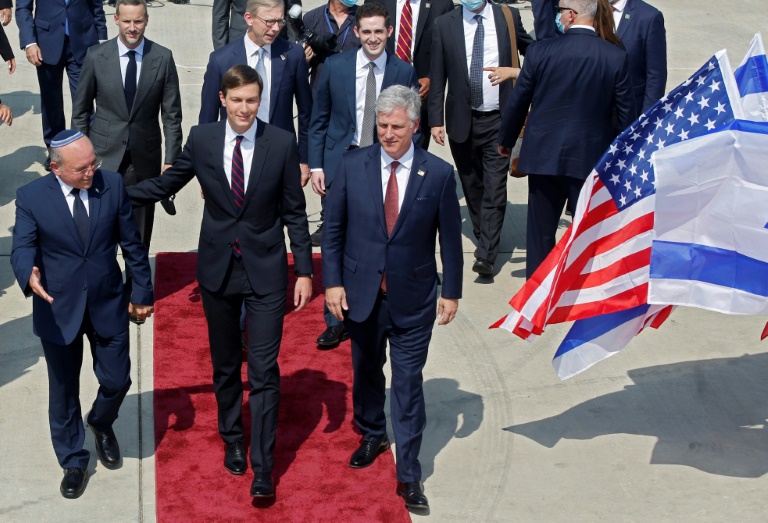 Outre Jared Kushner, le conseiller à la sécurité nationale Robert O'Brien et le responsable du dossier iranien Brian Hook voyagent sur le vol LY971 - nombre du code téléphonique international des Emirats - de la compagnie EL AL, au cockpit décoré des mots "peace, salam et shalom".