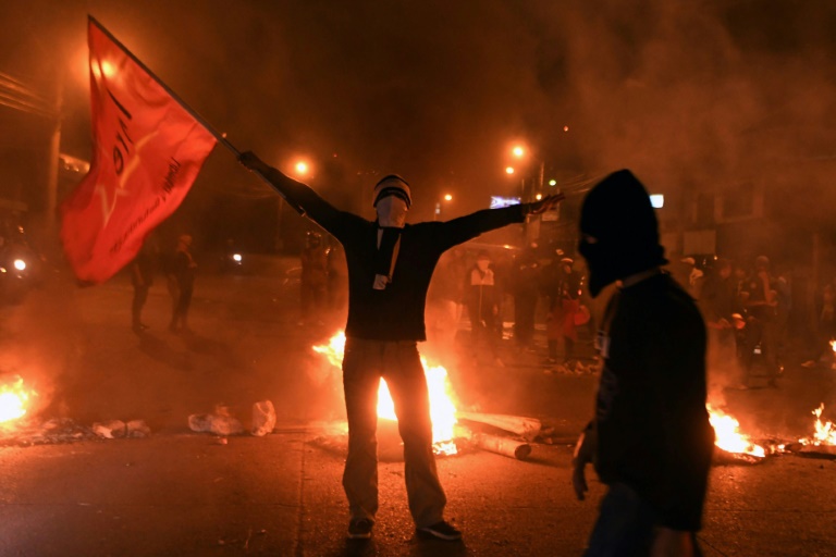 "Nous continuons à exprimer notre indignation, pour le moment de manière pacifique", a déclaré à l'AFP un manifestant au visage masqué devant une barricade enflammée.