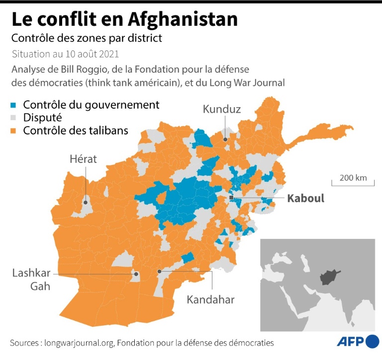 Les insurgés ont lancé leur offensive en mai, au début du retrait final des troupes américaines et étrangères, mais leur avancée s'est accélérée ces derniers jours avec la prise de plusieurs centres urbains. Le départ des forces internationales doit être achevé d'ici le 31 août, vingt ans après leur intervention dans la foulée des attentats du 11 septembre 2001 aux Etats-Unis.
