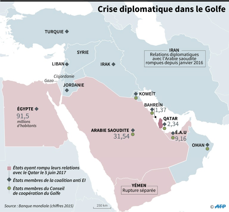 Désormais sur la touche dans la région, l'émirat a vu lundi matin l'Arabie saoudite, Bahreïn, les Emirats arabes unis, le Yémen, l'Egypte et les Maldives rompre toute relation diplomatique avec lui. Se sont ajoutées des mesures économiques comme la fermeture de toutes les frontières terrestres et maritimes entre ces pays et le Qatar, ainsi que des interdictions de survol aux compagnies aériennes qataries ou des restrictions aux déplacements des personnes.