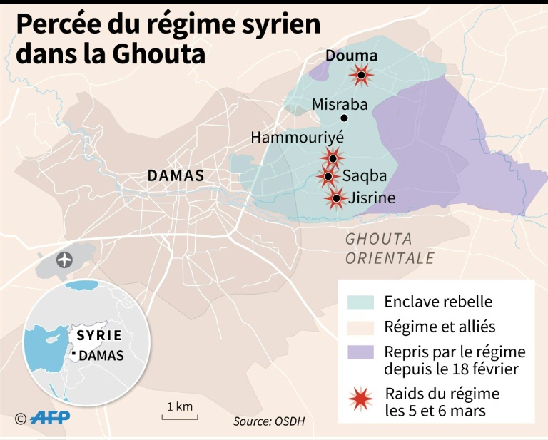 Les forces du régime progressent actuellement vers la grande ville de Douma et les localités de l'ouest de l'enclave rebelle, après avoir reconquis des secteurs dans l'est et le sud-est, d'après l'OSDH, qui dispose d'un vaste réseau de sources dans le pays.