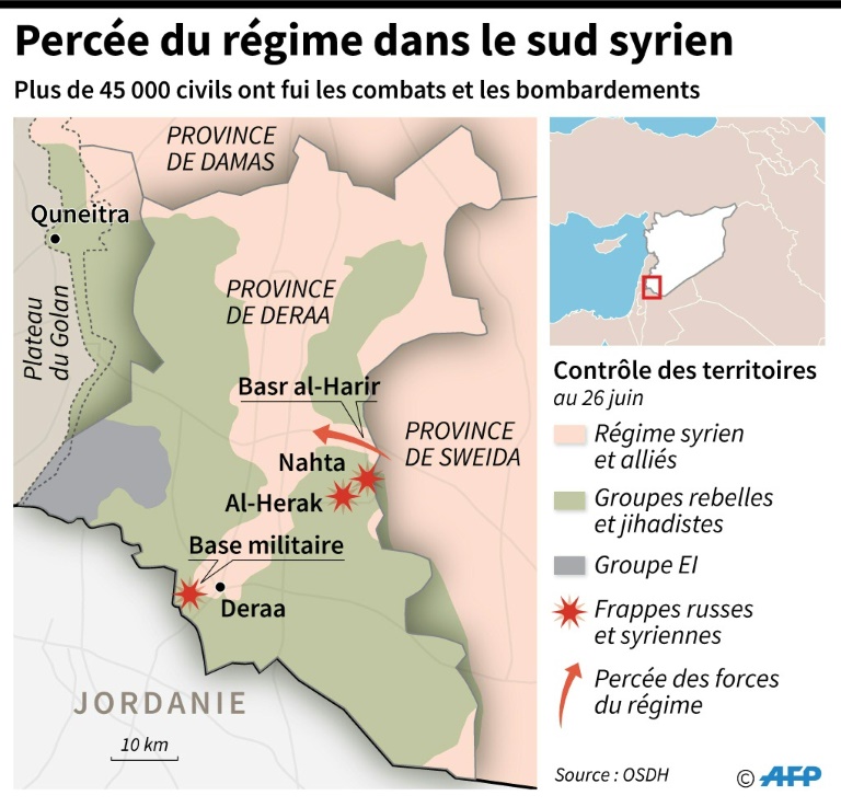 "Le régime cherche à prendre le contrôle d'une base militaire au sud de la ville, qui permet de couper la route entre Deraa et la frontière jordanienne, mais aussi morceler davantage les territoires rebelles" dans la province, a indiqué à l'AFP le directeur de l'OSDH, Rami Abdel Rahmane.