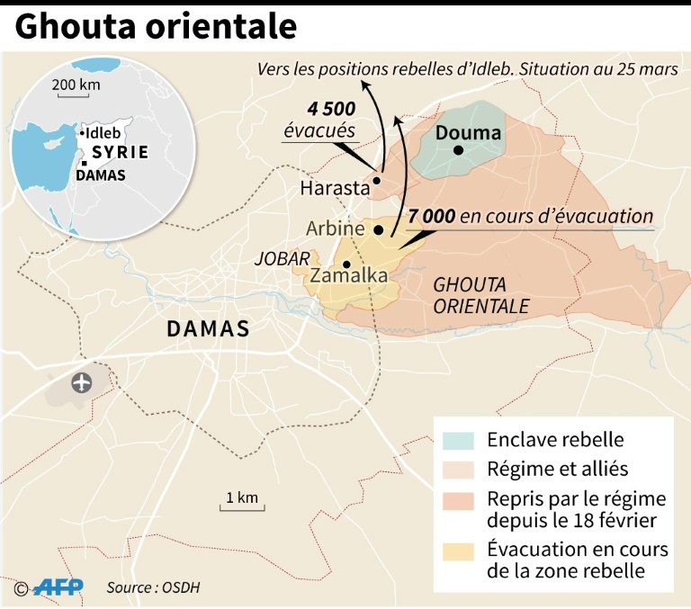 Lorsque cette évacuation massive sera terminée, les rebelles ne seront plus présents que dans une seule poche dans la Ghouta, autour de Douma, la plus grande ville du secteur, tenue par Jaich al-Islam, groupe islamiste qui a entamé des négociations avec l'allié russe.