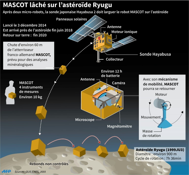 Le petit robot spatial franco-allemand Mascot a été largué mercredi sur un astéroïde par la sonde japonaise Hayabusa2, pour une mission éclair qui pourrait fournir de précieuses données sur la naissance du système solaire.