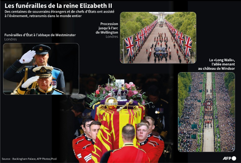 Les "adieux" à la reine dominaient encore mardi toutes les Unes de la presse britannique, qui rivalisait d'hommages et de photos des événements. Le Telegraph, proche des conservateurs, soulignait "une effusion d'amour".