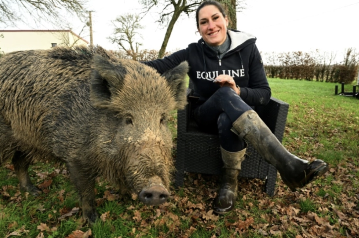 Élodie Cappé, à la tête d'une écurie privée près de Chaource, au sud de Troyes, a recueilli et adopté ce marcassin femelle qui s'était réfugié sur sa propriété. Rillette est aujourd'hui une adulte de 100 kg habituée aux humains.