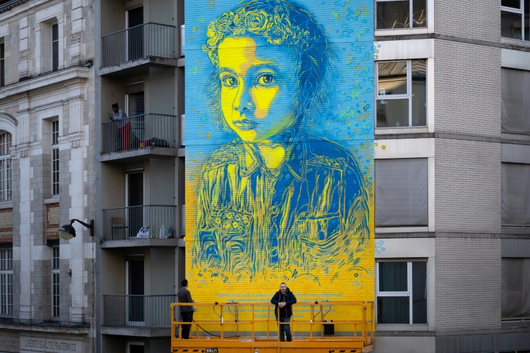 Après l'invasion russe, l'ancien collaborateur de Banksy avait déjà réalisé une immense fresque de la même fillette aux couleurs du drapeau ukrainien sur une façade du sud de Paris.