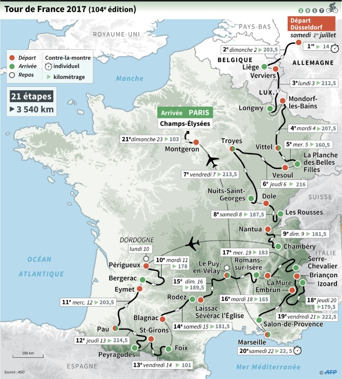 Un contre-la-montre de 14 kilomètres ouvre samedi à Düsseldorf le Tour de France 2017, l'événement de l'année cycliste convoité par les grands noms (Froome, Porte, Quintana, Contador, Bardet) d'une course très indécise et placée sous haute sécurité dès sa première journée.