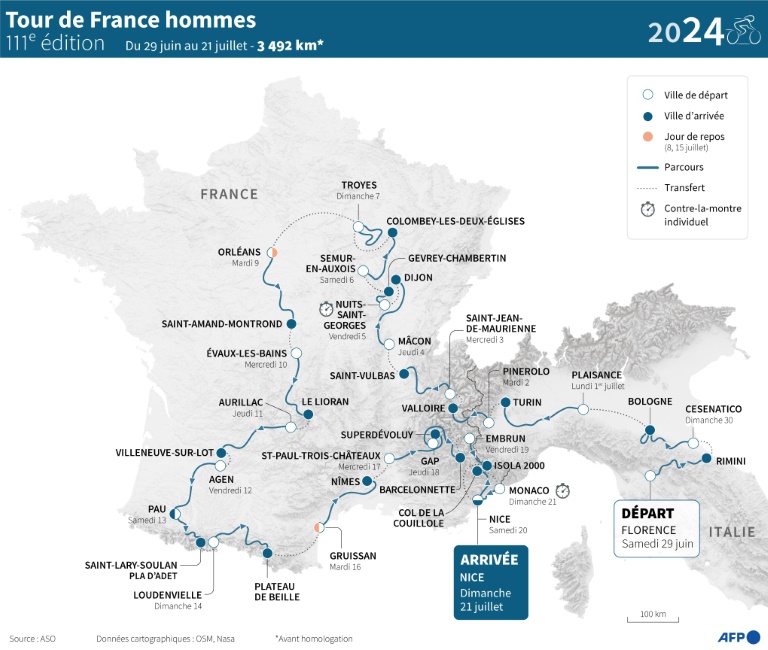Présentée mercredi au Palais des Congrès à Paris, la 111e édition de la Grande Boucle ne ressemble à aucune autre puisqu'elle partira pour la première fois d'Italie, de Florence le 29 juin, et arrivera pour la première fois hors de Paris, à Nice le 21 juillet.