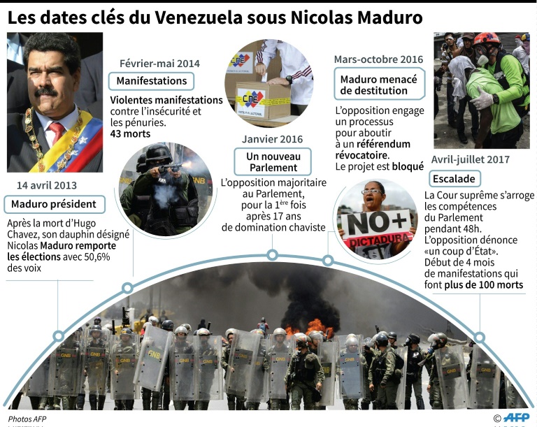 Il s'agit des derniers soubresauts de la violente crise politico-économique qui secoue le Venezuela depuis la victoire de l'opposition aux législatives, fin 2015. Les antichavistes voient dans ce projet de réécrire la Constitution un moyen pour M. Maduro de se cramponner au pouvoir, de contourner le Parlement élu, où l'opposition est majoritaire, et d'éviter l'élection présidentielle de la fin 2018.