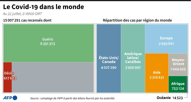 "Nous demandons à tout le monde de porter un masque quand la distanciation physique n'est pas possible", a-t-il lancé après avoir jusqu'ici défendu la "liberté" individuelle en la matière. La pandémie a fait au moins 616.965 morts dans le monde depuis fin décembre, selon un bilan établi par l'AFP mercredi, pour quelque 15 millions de cas officiellement déclarés.