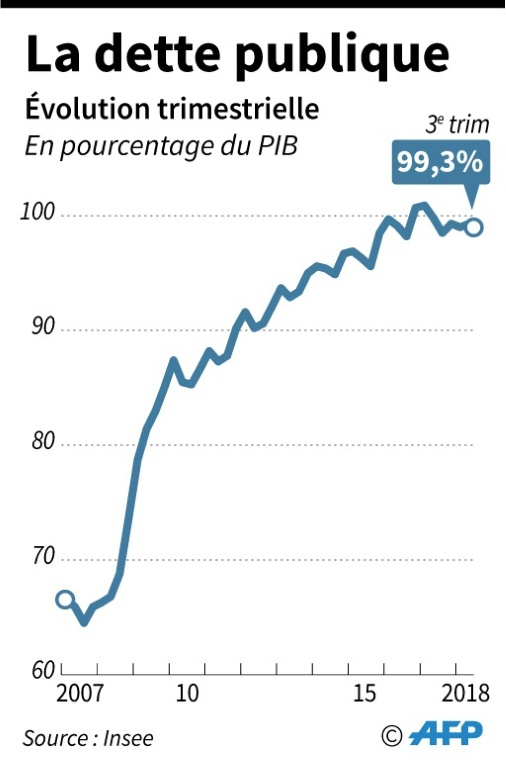 Après avoir révisé mardi de 1,6% à 1,5% la prévision de croissance pour l'année 2018, l'Insee a annoncé que la hausse du produit intérieur brut (PIB) n'avait finalement atteint que 0,3% au troisième trimestre, contre 0,4% calculé précédemment. Mais tandis que la croissance patine, la dette publique de la France se rapproche à nouveau du seuil symbolique de 100% du PIB, atteignant 99,3% à la fin septembre. Trois mois plus tôt, elle était de 99%, et sur une pente descendante. L'Assemblée nationale a porté lundi de 2,6% à 2,7% la prévision de déficit public pour 2018, alors que le gouvernement table désormais sur 3,2% en 2019, après une série de concessions visant à améliorer le pouvoir d'achat des couches sociales défavorisées et à calmer la colère des "gilets jaunes".
