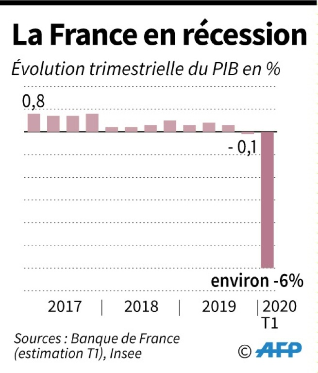 L'économie française n'aura pas mis longtemps à s'effondrer, heurtée de plein fouet par l'épidémie de Covid-19: dès le premier trimestre, le produit intérieur brut (PIB) a plongé, laissant augurer d'une récession d'une ampleur inédite cette année.