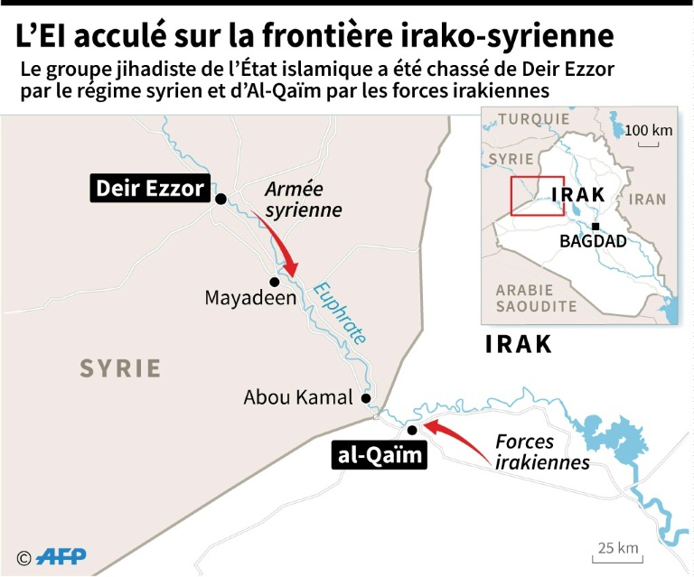 En 24 heures, l'EI a perdu deux importants fiefs: du côté irakien, Al-Qaïm, et surtout du côté syrien, Deir Ezzor, dernière grande ville sous son contrôle dans les deux pays voisins. Acculés dans une zone à cheval entre l'est de la Syrie et l'ouest de l'Irak, les combattants du groupe jihadiste font face à des offensives des deux côtés de la frontière.