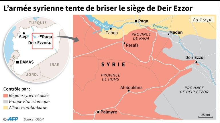 Dans la ville de Deir Ezzor, deux enclaves gouvernementales sont assiégées depuis 2015 par les jihadistes. Appuyées par les frappes de l'aviation russe, les unités les plus avancées des forces gouvernementales sont arrivées mardi à deux kilomètres de la ville, près de la base de la brigade 137, où des soldats du régime sont assiégés.