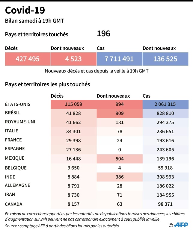 Au total, le Covid-19 a fait plus de 427.000 morts et contaminé plus de 7,7 millions de personnes sur la planète, selon un bilan établi par l'AFP à partir de sources officielles.