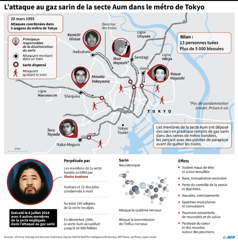 Aum est responsable de l'attentat au gaz sarin qui avait tué 13 personnes et en avait intoxiqué 6.300 autres dans le métro de Tokyo en 1995. Cette organisation créée par le gourou Shoko Asahara (de son vrai nom Chizuo Matsumoto) est tenue au total pour responsable du décès de 29 personnes et de 6.500 blessés. Outre Asahara, pendu le 6 juillet, douze de ses disciples s'étaient vu infliger la peine capitale. Ils sont désormais tous morts. Quelque 190 autres membres de la secte, qui a accueilli jusqu'à 10.000 fidèles, avaient également été condamnés à diverses sentences.