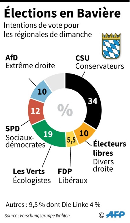 Près de dix millions d'électeurs ont commencé à voter dimanche pour un scrutin régional clé en Bavière qui risque de tourner au désastre pour la CSU, alliée de la chancelière allemande Angela Merkel dans un gouvernement qui n'a jamais été aussi impopulaire. "La grande coalition ne va pas devenir plus stable après dimanche", juge déjà le quotidien économique Handelsblatt, alors que les sociaux-démocrates du SPD, autre partenaire gouvernemental, s'attendent de leur côté à une complète déroute, face à la montée des Verts et du parti antimigrants AfD.