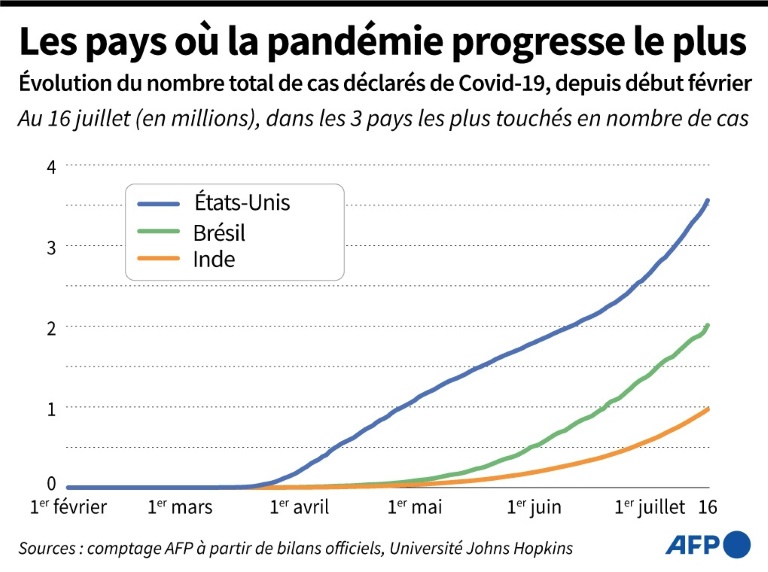 Le Covid-19, qui a tué au moins 590.000 personnes dans le monde, continue de se propager ou reprend dans de très nombreux pays, notamment sur le Vieux Continent où plusieurs Etats ont pris des mesures ciblées pour tenter d'éviter une deuxième vague. De l'autre côté de l'Atlantique, pour le troisième jour consécutif, les Etats-Unis ont enregistré un record journalier de nouveaux cas: plus de 77.600.