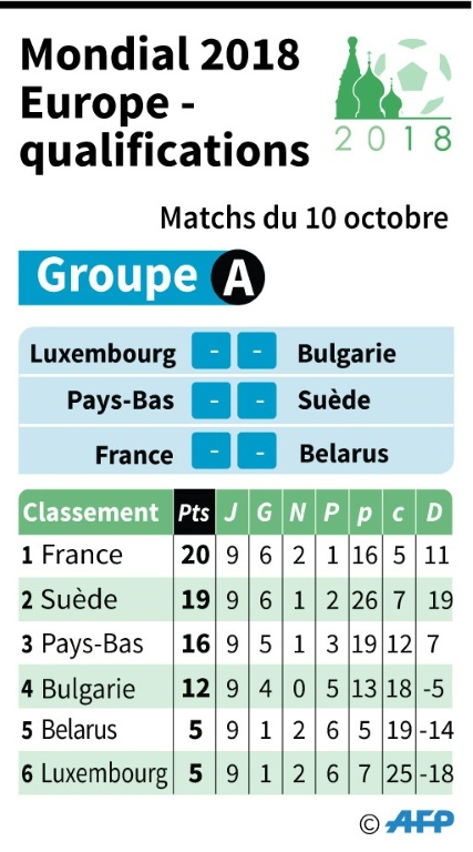 Une victoire au Stade de France et les Bleus iront au Mondial, leur sixième d'affilée. Ils iront aussi directement en Russie s'ils obtiennent un résultat équivalent ou supérieur à celui de la Suède (2e), qui se déplace aux Pays-Bas. Sinon, il faudra passer par les barrages, un gros échec pour le finaliste de l'Euro et une étape angoissante pour les hommes de Didier Deschamps, qui ont alterné le bon et le décevant tout au long de ces éliminatoires.