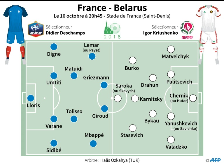 Déjà éliminés, les Bélarusses ne jouent plus rien. Ils veulent terminer "avec dignité" ces éliminatoires et rêvent de décrocher, comme au match aller (0-0), le point du match nul contre la France, a expliqué l'entraîneur Igor Kriushenko. Ils sont en outre privés de leur attaquant Nikolai Signevich, suspendu.