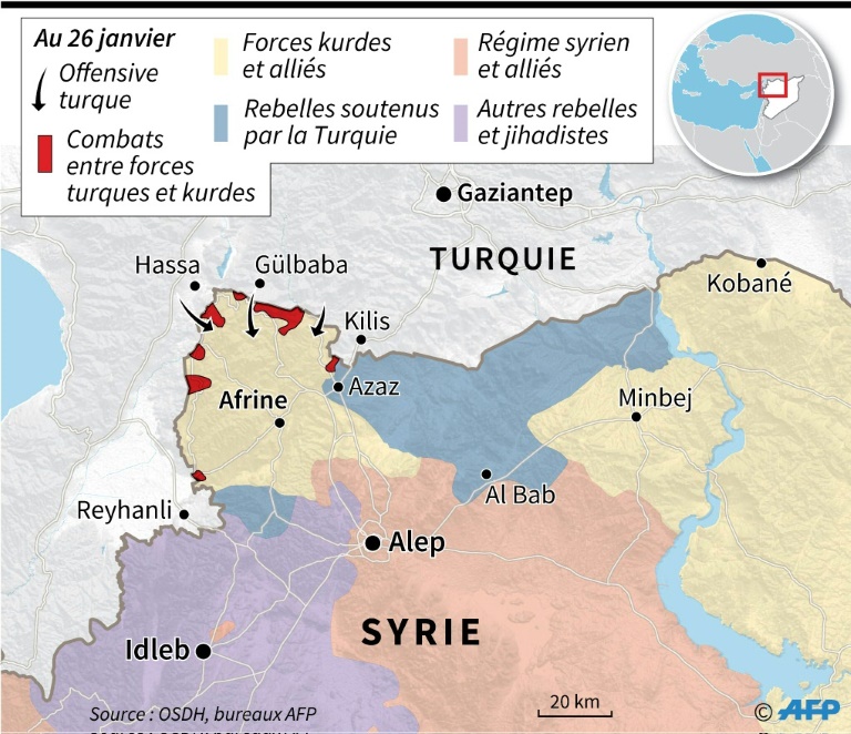 Profitant du temps clair après plusieurs jours et pluie et de brouillard, l'aviation et l'artillerie turques ont pilonné dans la matinée la colline de Barsaya, dans la région d'Afrine (nord-ouest de la Syrie), a rapporté l'agence de presse étatique Anadolu. La Turquie mène depuis le 20 janvier une offensive dans cette région contre les Unités de protection du peuple (YPG). Ankara qualifie ce groupe de "terroriste", qui est l'allié de la coalition antijihadistes emmenée par Washington.