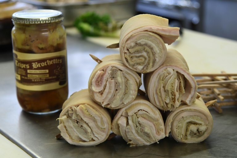Mais la joyeuse troupe en robes colorées et chapeaux, arborant de larges médailles autour du cou et rassemblée autour d'une marmite vernie à Bagnoles-de-l'Orne en Normandie, est composée des doyens et doyennes d'une confrérie bien française, dédiée à la promotion des délices gastronomiques des tripes -- les quatre parties de l'estomac des ruminants.