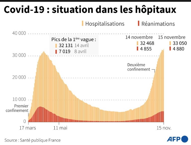 Après une flambée des contaminations, l'épidémie de Covid-19 semble régresser et les courbes des nouvelles entrées à l'hôpital se stabilisent en France, mais "il est trop tôt pour crier victoire" prévient le gouvernement, confronté au défi de Noël.