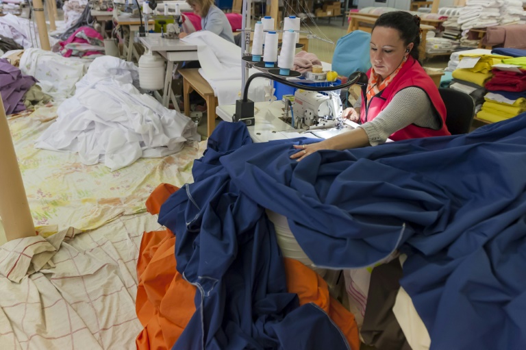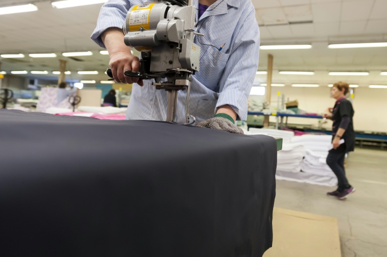 Irène, chez Blanc des Vosges depuis 1974, a vu "les clients vouloir des choses plus précises, plus pointues. Avant c'était beaucoup juste du blanc, c'était moins diversifié", explique-t-elle en enfilant le gant en cote de maille qui protège sa main avant de suivre, à l'oeil nu, un trait de crayon à papier formant le patron d'un drap.