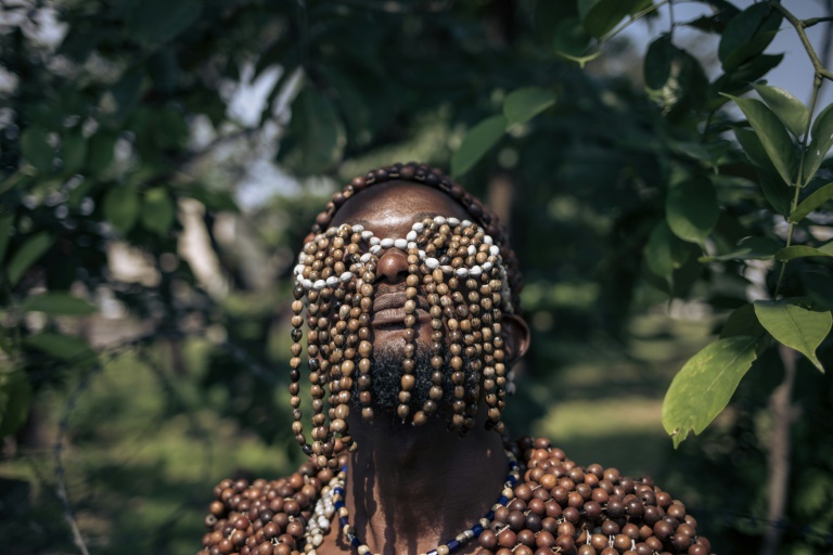 Kadhi Kadhitoza, 53 ans, a fabriqué lui-même son costume de toile locale, avec des cauris comme boutons.