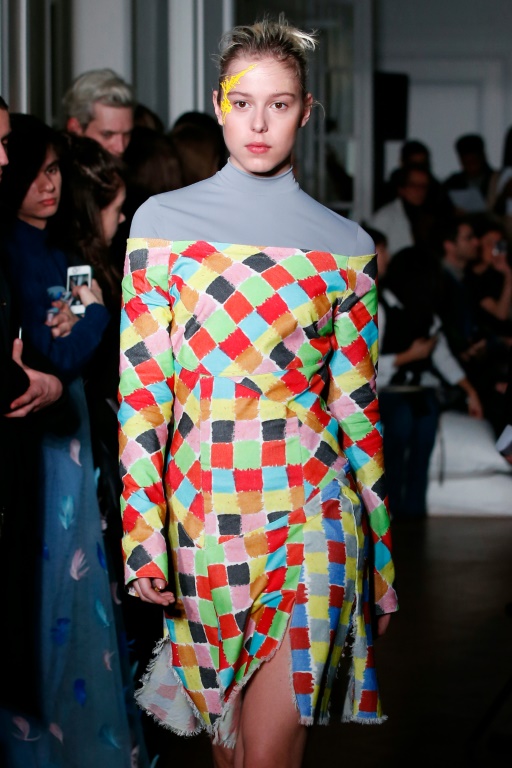 Mêmes épaules imposantes du côté de la marque japonaise Anrealage, dont le défilé avait pour bande son des bruits parfois assourdissants. Le créateur Kunihiko Morinaga a poursuivi ses expérimentations technologiques: pour cette collection, les motifs des vêtements se révèlent à travers un filtre transparent. Des losanges, ronds et fleurs apparaissent sur des robes au tons gris quand les mannequins passent derrière une cloison transparente installée au milieu du podium.