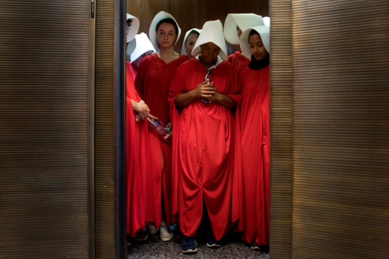 "Davantage de femmes vont être forcées d'avorter clandestinement", a hurlé une manifestante. Des femmes vêtues de coiffes blanches et de robes rouges, à la manière des personnages du livre et de la série télévisée "La Servante écarlate" (The Handmaid's tale") s'étaient rassemblées dans les couloirs.
