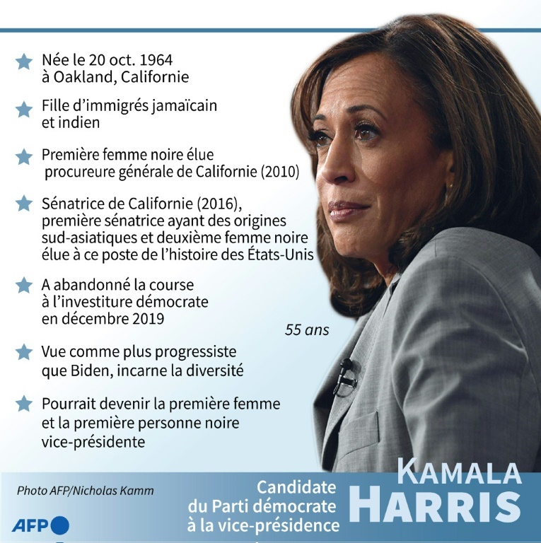 Le discours de la candidate à la vice-présidence tout nouvellement désignée, Kamala Harris, 55 ans sera aussi très attendu mercredi. Sénatrice, ex-procureure, cette fille d'immigrés jamaïcain et indienne est la première candidate à la vice-présidence noire et originaire du sud de l'Asie choisie par un grand parti. Tous deux s'exprimeront depuis Wilmington, dans le Delaware, où réside l'ancien vice-président de Barack Obama.