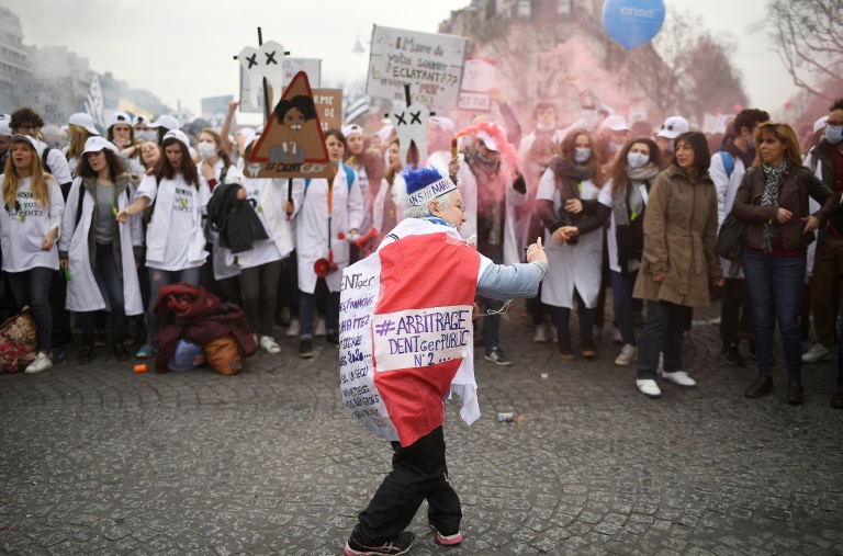 Pour beaucoup en blouses blanches, les manifestants étaient réunis dans une ambiance bon enfant place Vauban, non loin du ministère de la Santé dans le VIIe arrondissement, au milieu des fumigènes et au son des sifflets, pétards et même d'une fanfare.