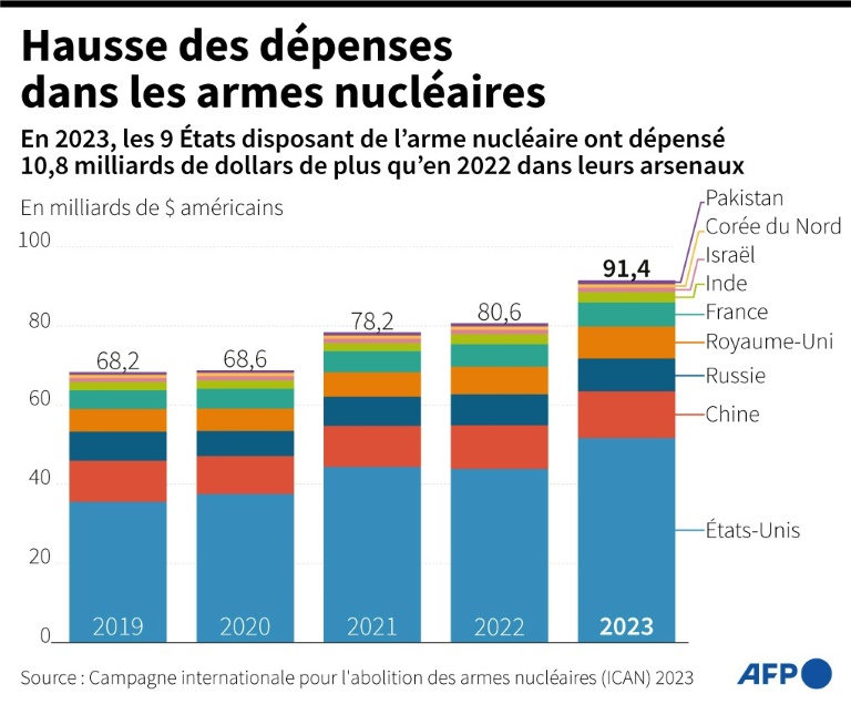 Selon l'ICAN, les dépenses mondiales en matière d'armement nucléaire ont augmenté de 10,8 milliards de dollars en 2023 sur un an, les Etats-Unis représentant 80% de cette augmentation.